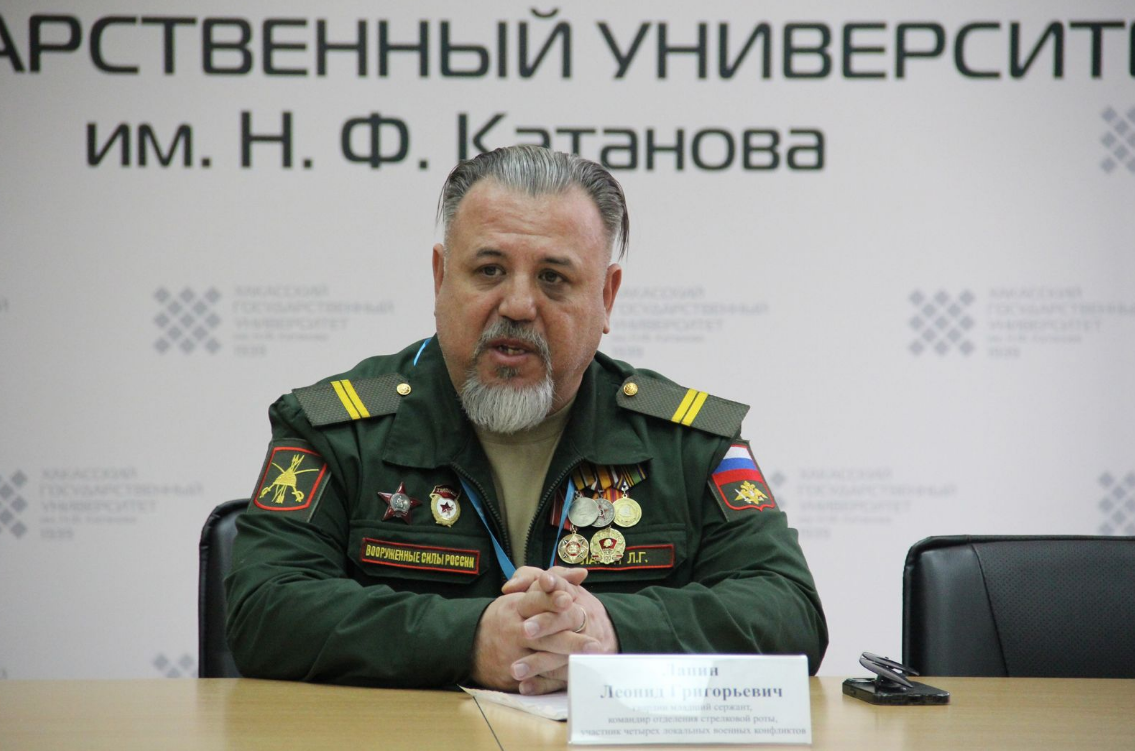 Совет обучающихся Хакасского госуниверситета пригласил студентов вуза на встречу с Леонидом Григорьевичем Лапиным – члена Общероссийской общественной организации “РОССИЙСКИЙ СОЮЗ ВЕТЕРАНОВ АФГАНИСТАНА и СПЕЦИАЛЬНЫХ ВОЕННЫХ ОПЕРАЦИЙ” в Республике Хакасия, гвардии младшим сержантом, командиром отделения стрелковой роты снайперов, участником четырёх локальных военных конфликтов, героем СВО. Он также – лектор Российского общества «Знание». Активную помощь в организации и проведении встречи оказали участники военно-патриотического клуба «Я горжусь». Она оставила глубокий след в сердцах всех присутствующих. Леонид Лапин поделился своим опытом и мыслями о важности единства народов, национальных приоритетах, а также о необходимости сохранения исторической памяти и воспитания патриотизма. Он подчеркнул, что только помня прошлое, мы можем построить достойное будущее. Особенно трогательным моментом встречи стал рассказ Леонида Григорьевича о его семейной истории. Студенты узнали, что в основу лег