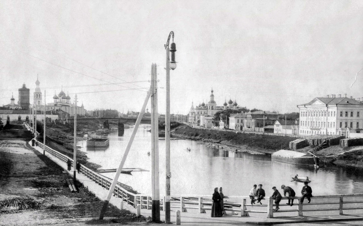 Снимок начала ХХ века, сделанный с балкона Александровского реального училища (сейчас неиспользуемое здание школы №1). Справа за кадром исторический деревянный Красный мост. Слева идёт Пречистенская набережная, как и сейчас, а по другому берегу видна Дмитриевская набережная, которая шла от церкви Иоанна Златоуста и до Красного моста.