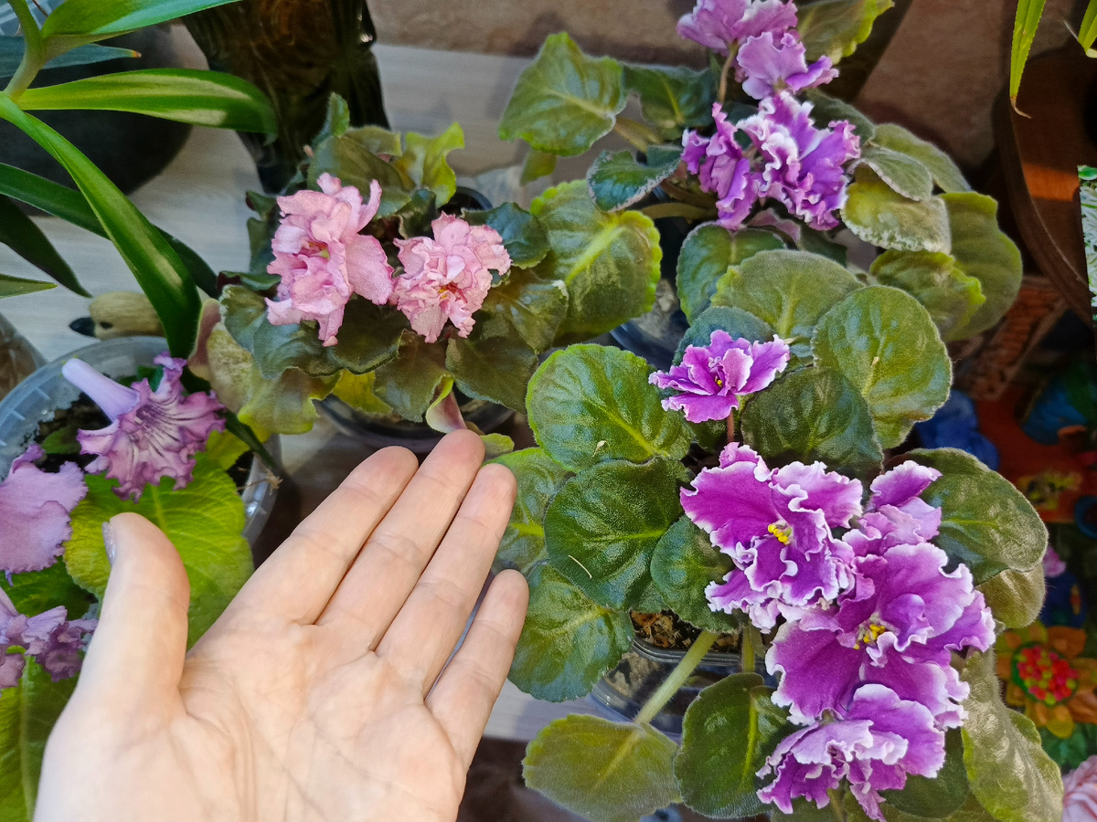 Фиалки узумбарские или фиалки наши домашние это просто великолепные красивые цветы. Фиалки занимают мало места , они есть и миниатюрные если хотите, цветы разные и по форме и по окраске. Листья тоже есть и разные по форме и по окрасу. Ну как не любить эти цветы. У меня много фиалок я их обожаю. Как я ухаживаю за ними, чтобы они пышно цвели? Фиалки растут у меня на фитильном поливе. Я их ни чем не удобряю. На фитильном поливе они не пересыхают и не испытывают стресс от недостатка воды. Стоят мои фиалки без досветки, стоят на подоконнике. У меня грунт не просто земля, а цеолит и кокосовая смесь, больше цеолита там конечно. И поэтому грунт лёгкий и пропускает много воздуха. Корни в таком грунте не гниют и не залипают в грунте, как в обычном грунте. Корни не мёрзнут хотя и на фитиле, да ещё и на подоконнике. И вот к весне они зацвели пышными цветами. Они не болеют и их не поражают мошки и другие насекомые. Всё зависит от грунта ,всё таки я раньше сажала фиалки в обычном покупном грунте и о