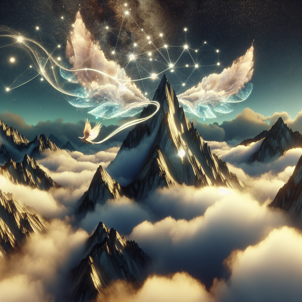 Здесь вершины не пронзают облака — они плавают в них. Лёгкий, светящийся туман окутывает эти горы, а каждый шаг по уступам оставляет за собой яркие линии, будто свет движется вместе с путником. Камни здесь не простые — они испещрены мерцающими символами, складывающимися в непонятные узоры, медленно меняющиеся от дыхания ветра. А в небе над горами плывут небесные существа — огромные парящие создания с крыльям, подобными облакам, их движения так мягки и невесомы, что кажется, будто они вовсе не подчиняются гравитации.