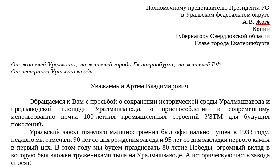 Коллективное обращение жителей ЗА сохранение исторической среды Уралмашзавода (1928-1934)