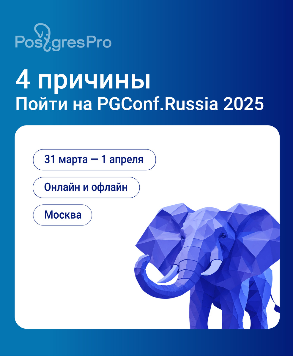 Есть много причин пойти на крупнейшую конференцию по PostgreSQL, но сегодня мы расскажем о 4 главных, все подробности — в карточках. ⚡️ Уже 31 марта — 1 апреля соберемся в Москве в Центре международной торговли, а также онлайн. Изучайте расписание, записывайтесь на мастер-классы и до встречи на конференции! Регистрация на PGConf.Russia 2025