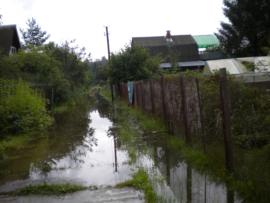 Каждый год у нас бывает такой «сюрприз»: То весеннее половодье, то затопление после сильного дождя. Наблюдаем, как вода прибывает: Обводные канавы переполнены. Хорошо, что плиты лежат, щебень давно бы размыло. Надеваю уровне-измерительный прибор (сапоги). В эту сторону еще двигаться можно. Здесь глубже, лучше не ходить. ЧТО ВНУТРИ участка: Вода, кругом вода.. Въезд, стоянка для автомашины под водой: В парнике тоже стоит вода: Вода стоит и в междурядьях: Болото, оно и через 50 лет болото, правда облагороженное. А сколько земли, глины, песка и прочего добра было завезено! Да еще бобры поселились в конце обводной канавы запруду периодически делают. Оно когда засуха хорошо, а когда лето дождливое, приходится их запруду разбирать. Вот так и живем, и счастливы каждый по- своему. Друзья, как у вас обстоят дела с подобными затоплениями?