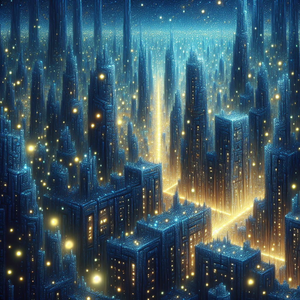В глубине вечного сумеречного мира, где ночное небо искрится, как поверхность загадочного озера, раскинулся город, утопающий в мягком сиянии. По улицам, проложенным среди высоких деревьев с серебряной корой, медленно парят миллионы светлячков. Они испускают свет столь нежный и живой, что создаётся ощущение, будто целый мир дышит мерцающим свечением. Здания этого города словно выточены из плавленного кварца — их стены почти прозрачны, а внутри них пульсирует тёплый голубой свет. Дворцы со светящимися колоннами парят в воздухе, соединённые между собой мостами из лунного камня, который переливается под каждым шагом, оставляя за собой узоры, напоминающие карту звёздного неба.