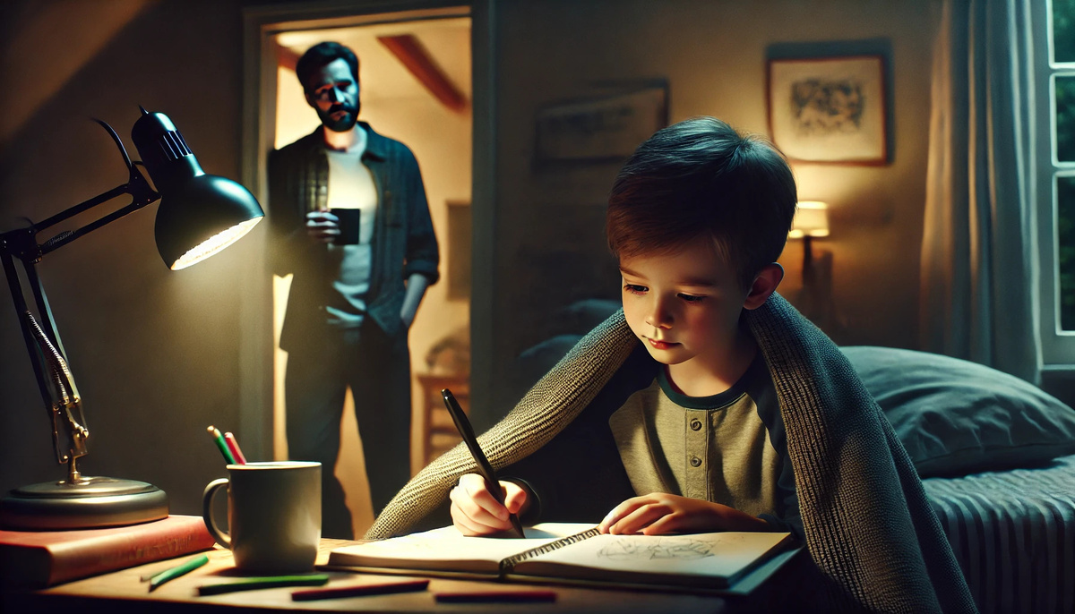 Но больше всего он любил рисовать ночью, под одеялом с фонариком, когда весь дом засыпал и даже холодильник начинал дышать тише. Его любимой темой была семья. Только не та, которая жила за соседней дверью, а та, которая жила в его голове. В его мире мама всегда успевала всё: работа, блины по утрам, объятия, смех. А папа был героем. Тёплым, внимательным, добрым. Настоящим супергероем — не по силе, а по присутствию. В реальности же всё было иначе.