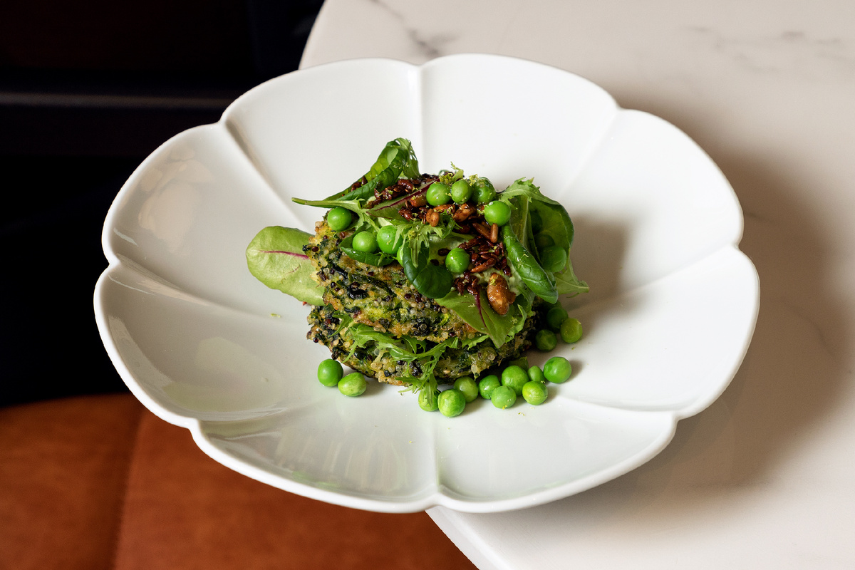 Даже самая капризная принцесса на горошине останется в восторге от полезных и вкусных зеленых оладьев из брокколи, шпината, киноа и горошка с пряными травами и постной сметаной (890 руб.), щедро украшенных молодым и нежным зеленым горошком.