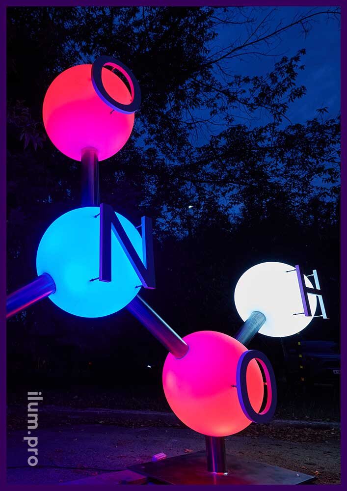 Задача Производитель удобрений и промышленной продукции, расположенный в Смоленской области, хотел украсить свою территорию уникальным арт-объектом, который бы отражал специфику их деятельности, привлекал внимание и создавал запоминающийся образ. Решение Была разработана и установлена светящаяся фотозона в виде объемной молекулы азотной кислоты (HNO₃). Конструкция состояла из шаров красного, синего и белого цветов, соединенных трубами из полированной нержавеющей стали. На шарах были установлены буквы, символизирующие химические элементы: кислород (O), водород (H) и азот (N). Особенности конструкции 1. Материалы: — Шары изготовлены из высококачественного УФ-стабилизированного полиэтилена низкой плотности, который устойчив к перепадам температуры, осадкам и механическим повреждениям.