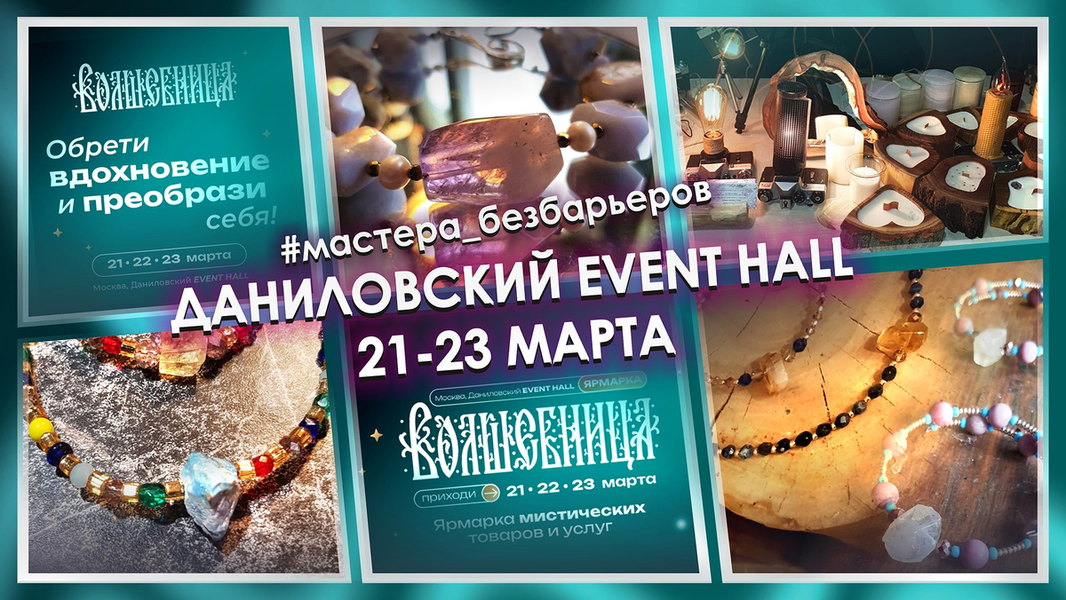 Даниловский Event Hall полностью доступен для маломобильных! Ярмарка «Волшебница» – самая крутая площадка для горячих поклонников натуральных камней! Украшения, обереги, няшечки и мимишечки – всё найдется на «Волшебнице». Но самая главная находка – это наша волшебная Мария-Искусница. Чаровница и обаяшка. Три дня на стенде мастеров «Без Барьеров» будут сиять и переливаться изделия из натуральных камней, над которыми колдовала Маша. С каким восторгом она говорит о своём увлечении, с каким жаром, с каким пылом и любовью! Ты всем сердцем чувствуешь, что в любом её творении, даже самой крохотной подвесочке для ключей, заключена негасимая частица Солнца Создателей. Мы благодарны организаторам «Волшебницы» за неизменную поддержку! Где: Даниловский Event Hall – Дубининская, 71 (м. Тульская) Когда: от сейчас и до 23 марта ТОЛЬКО 18+