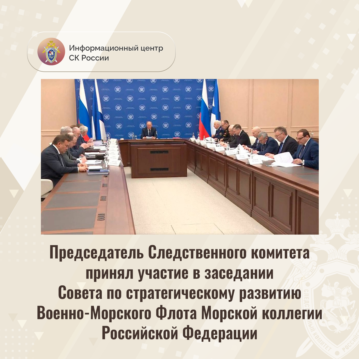 Председатель Следственного комитета принял участие в заседании Совета по стратегическому развитию Военно-Морского Флота Морской коллегии Российской Федерации Председатель Следственного комитета Российской Федерации Александр Иванович Бастрыкин принял участие в заседании Совета по стратегическому развитию Военно-Морского Флота Морской коллегии Российской Федерации. На мероприятии, которое провел помощник Президента России, председатель Морской коллегии РФ Николай Платонович Патрушев, присутствовали представители федеральных министерств и ведомств, а также организаций, задействованных в морской деятельности. В рамках заседания был рассмотрен проект Стратегии развития Военно-Морского Флота, в котором будут сформулированы цели и задачи военно-морского флота на ближайшую и долгосрочную перспективу, а также приоритеты в области его строительства и развития. Также предметом рассмотрения на заседании стал проект Стратегии развития корабельного состава органов федеральной службы безопасности,