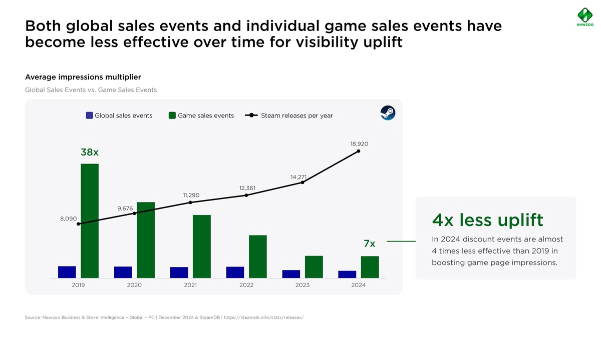 Скидки всегда были важной частью успеха Steam. Мероприятия вроде Steam Summer Sale, Daily Deals и другие играли ключевую роль в привлечении пользователей. Однако с 2019 года эффективность распродаж снизилась в четыре раза. Огромное количество игр, участвующих в распродажах, делает конкуренцию более жесткой, чем когда-либо, что затрудняет привлечение внимания к большинству проектов. Согласно отчету NewZoo, индивидуальные скидки на игры по-прежнему приносят больше продаж и трафика, но их эффективность тоже снижается. Если раньше распродажи были основным фактором роста трафика, то теперь более важными стали внешние факторы, такие как сотрудничество с инфлюенсерами и другие платные методы продвижения. Примечательно, что падение трафика никак не связано с продажами, которые с каждым годом показывают уверенный рост, и ростом самого Steam продолжает расти, у которого более 40 миллионов одновременных игроков. Комментарии на сайте