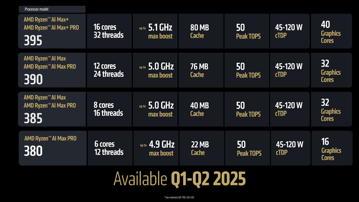 Также была представлена серия Ryzen AI Max PRO, для на бизнес-ноутбуков и рабочих систем. Например, младшая модель Ryzen AI Max PRO 380 получила 6 ядер и 12 потоков, при тактовой частоте до 4,9 ГГц. Встроенный нейропроцессор на архитектуре XDNA 2 показывает приличную производительность в 50 TOPS (триллионов операций в секунду).