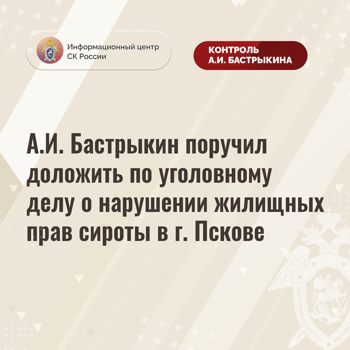 А.И. Бастрыкин поручил доложить по уголовному делу о нарушении жилищных прав сироты в г. Пскове В адрес Председателя СК России А.И. Бастрыкина через его приёмную «ВКонтакте» поступило обращение от жительницы города Пскова по вопросу необеспечения ее супруга, являющегося сиротой, положенным по закону жилым помещением. С 2013 года мужчина состоит в специализированной очереди. Несмотря на то, что в 2023 году суд обязал администрацию предоставить ему жилплощадь, до настоящего времени права сироты не реализованы. Многочисленные обращения в уполномоченные органы результатов не принесли. В СУ СК России по Псковской области по доводам, изложенным в обращении, возбуждено уголовное дело. Председатель Следственного комитета Российской Федерации Александр Иванович Бастрыкин поручил руководителю СУ СК России по Псковской области Петру Николаевичу Крупене доложить об установленных в ходе проведенных следственных действий обстоятельствах, а по завершении расследования уголовного дела – о его результ