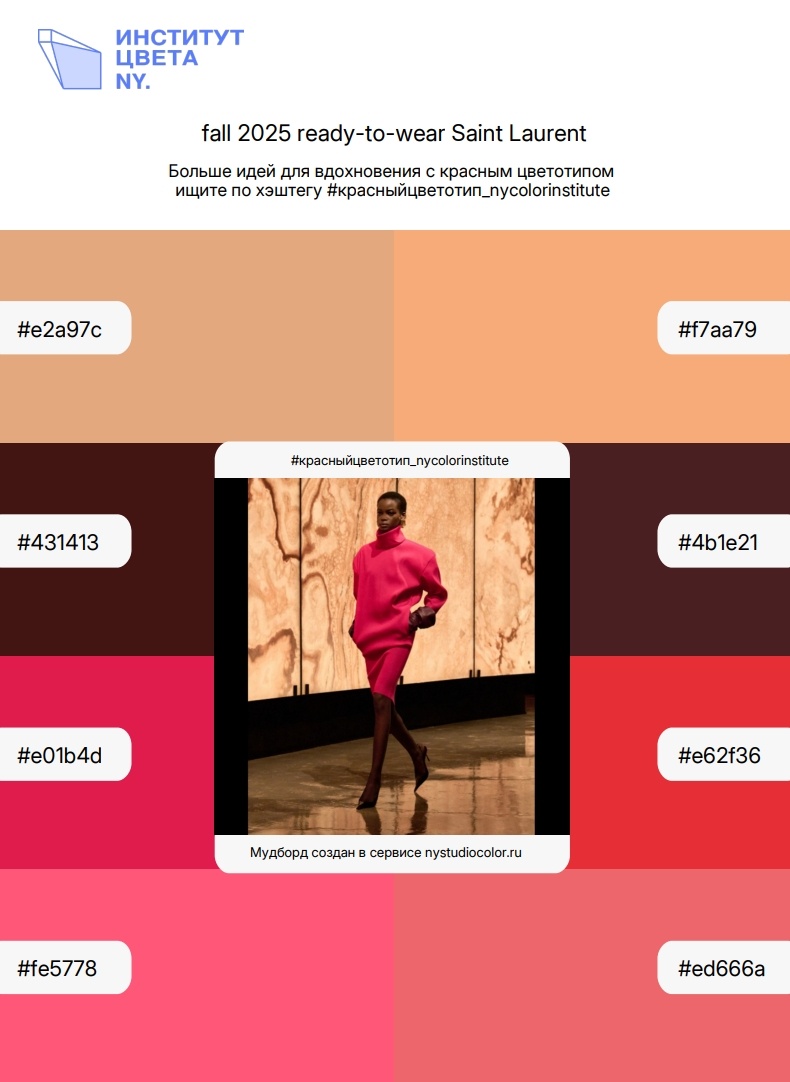 Показ Fall 2025 ready-to-wear Saint Laurent обогатил нас очными цветовыми сочетаниями, выдержанный в красно-содержащих цветах. Нас интересует разбор колорита, как отдельных выходов моделей так и всего показа. Смотрим и наслаждаемся этими чудесными и наполненными глубоким цветом палитрами относящимися в красному, фиолетовому и оранжевому колориту внешности. Так же вам может понравиться эта статья про выбор красной помады к цветотипу внешности https://dzen.ru/a/Z7XcfZ7XnnF8Caxm