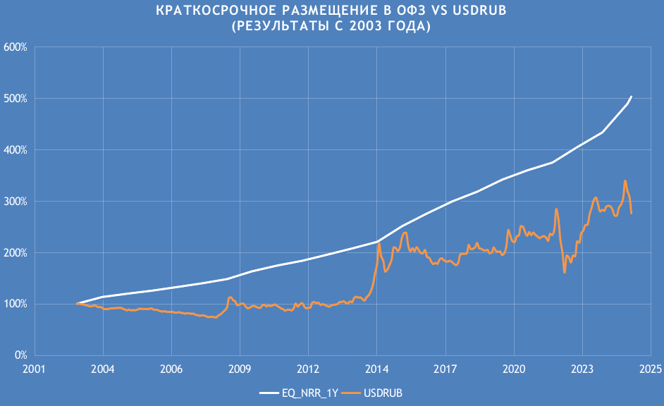 Давайте обратимся к расчётам. На сайте ЦБ можно найти данные по кривой доходности ОФЗ начиная с 2003 года, если построить эквити краткосрочных вложений (1 год) по данным с этой кривой, то за 23 года такой мега консервативный инвестор увеличил бы свой капитал чуть больше, чем в 5 раз к текущей дате. Если бы инвестор держал просто доллары, то он бы увеличил свой капитал только в 2,75 раза, что существенно меньше. (Тут, многие возбудятся, и скажут, что надо было бы рассматривать не просто доллар, а ещё инвестиции в нём, но окажется, что построив такую же эквити по трежурам и переведя её в рубли, прирост капитала инвестора будет немногим меньше чем в 4 раза, что снова сильно меньше ОФЗ. Однако, я оставлю дальнейшее сравнение с долларом без инвестиций, так как нарратив подаётся именно в такой форме, что простая покупка долларов лучше, чем какие бы то ни было инвестиции в России в принципе).