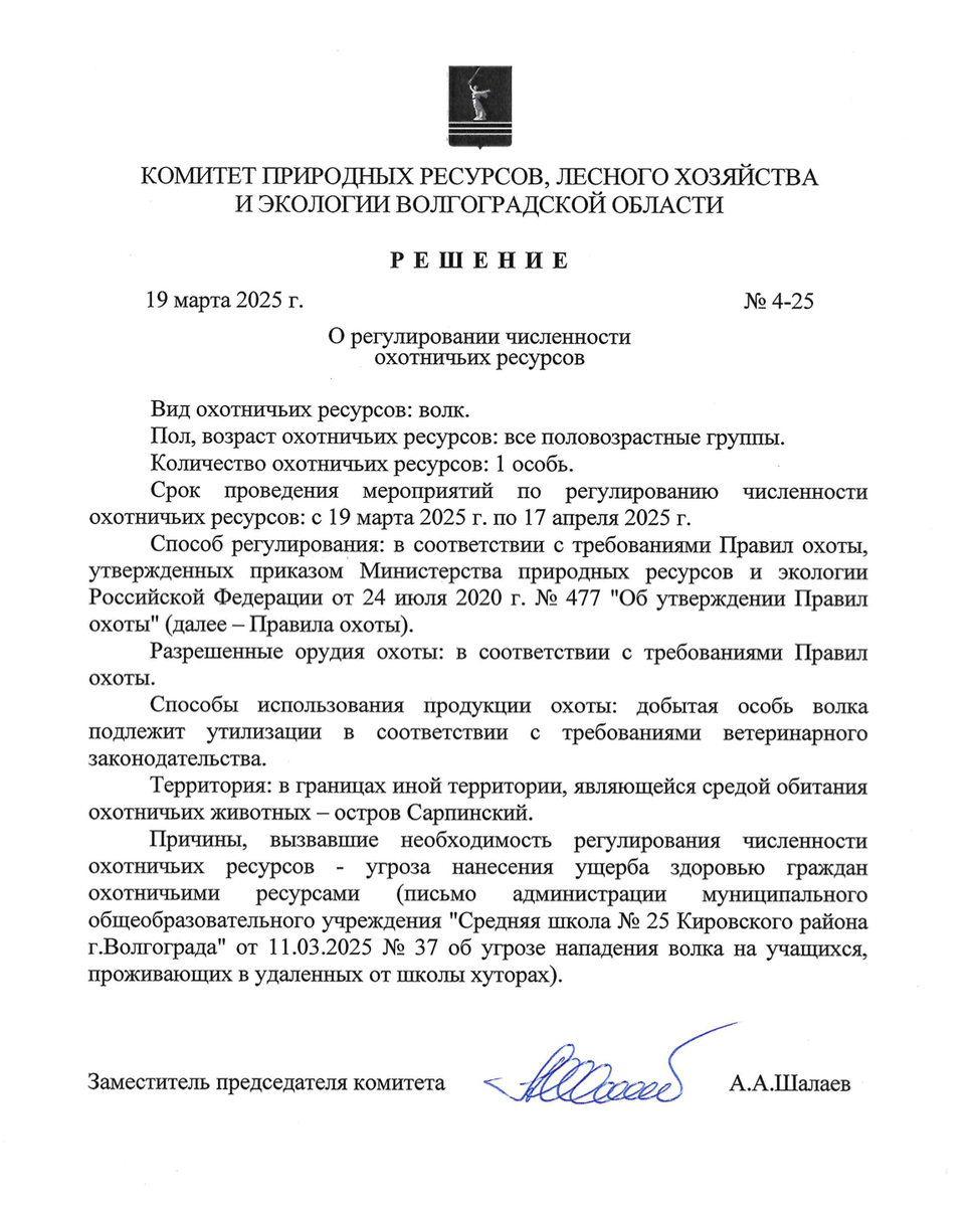 Пока еще не превращенный в волгоградские Мальдивы остров Сарпинский удивил своим биологическим разнообразием — здесь обнаружили дикого волка. В местной школе №25 всерьез опасаются, что животное может угрожать жизни и здоровью учащихся, которые проживают в отдаленных хуторах на территории острова. Комитет природных ресурсов, лесного хозяйства и экологии Волгоградской области отреагировал на письмо школьной администрации и вынес решение - волка надо устранить. Охотникам поставлен для этого срок до 17 апреля. После этого добытая особь волка подлежит утилизации в соответствии с требованиями ветеринарного законодательства.