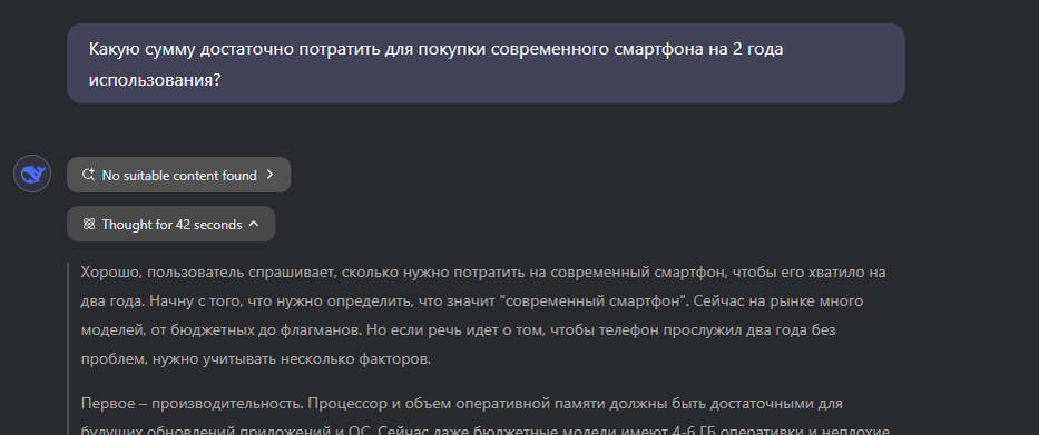 Пока изо всех утюгов говорят о том, что нейросети скоро заменят программистов, учителей и врачей, остается неясным: "как нейросеть может быть полезна для простого человека уже сейчас?" Вариантов реализаций нейросетей огромное множество и у каждой своя роль. На мой взгляд, наиболее полезным вариант нейросети можно рассмотреть ИИ, которые могут искать и обобщать информацию. Это могут быть Deepseek, ChatGPT и другие. В этой статье я разберу ряд сценариев использования нейросеток напримере Deepseek, т.к. она является одной из самых технологичных и не требует каких-то особенных настроек интернета, регистрации с зарубежных номеров телефона и других посредников. Для регистрации в Deepseek достаточно иметь учетку Google. Предположим, Вам нужен новый смартфон, но вы в технологиях не разбираетесь и решаете сделать запрос в поисковик. Но вместо реальных советов натыкаетесь на сплошные заказные рекламные статьи. А хочется получить реальные рекомендации, сколько потратить денег на новую вещь и зак