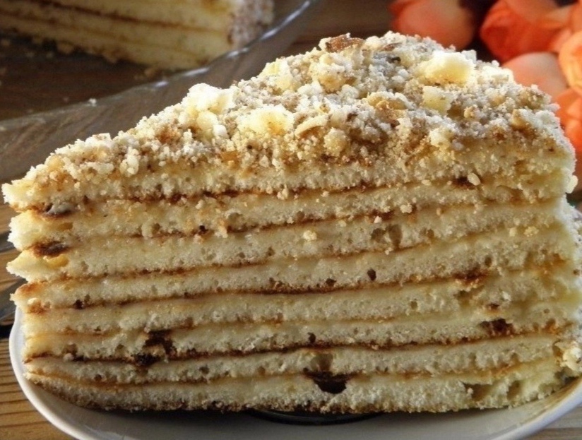 1. Берём банку со сгущенкой, на ней мы и будем готовить тесто. А для крема нам понадобятся сметана и сахар. 2. Переливаем сгущенку в удобную глубокую миску. Добавляем яйцо, перемешиваем. 3. Муку всыпаем постепенно частями, сразу добавляя разрыхлитель. 4. Замешиваем тесто. Слишком крутое не стоит делать, как только перестало липнуть, значит — готово. Разделяем его на 8 частей. Каждый кусочек теста раскатываем приблизительно по диаметру своей сковороды. Прокалываем вилкой в нескольких местах, чтобы тесто не вздувалось во время жарки. Не стоит слишком тонко раскатывать, иначе будут рваться коржи при переносе на сковородку. 5. Жарим коржи на сухой и чистой сковороде на медленном огне с двух сторон. 6. Когда все коржи будут готовы, берём тарелочку чуть меньшего диаметра и обрезаем по её размеру все коржи. Обрезки не выбрасываем, их нужно подсушить на сковороде и измельчить в кофемолке, а полученной крошкой украсить наш тортик! 7. Смешиваем сметану с сахаром. Каждый корж смазываем кремом.