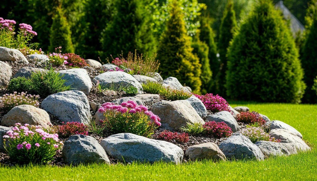 - Хвойные растения: Карликовые сосны, можжевельник, туя. Они придают горке объем и сохраняют декоративность круглый год.