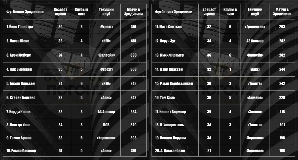 Продолжаем в Нидерландах. Ниже представлены лидеры среди действующих игроков Эредивизи по количеству сыгранных матчей в чемпионате. В списке указаны их возраст, число клубов Эредивизи, за которые они выступали, а также нынешняя команда.