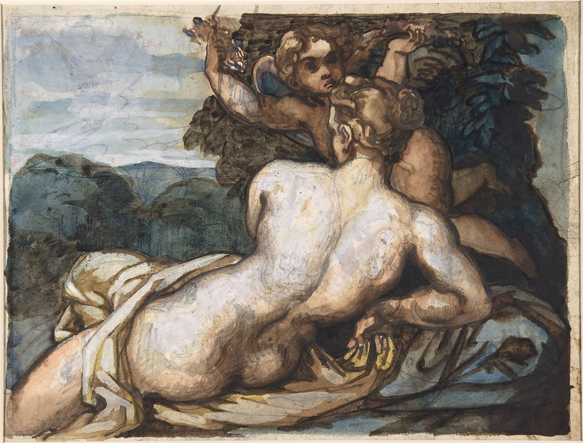 Глубокое уважение Теодора Жерико (1791-1824) к мастерам эпохи Возрождения и барокко оказало сильное влияние на его творчество, позволив создать оригинальный стиль, который отличался от неоклассических норм того времени. Изучение гравюр Микеланджело, Караваджо, Рубенса, Карраччи и других мастеров, а также непосредственное знакомство с итальянской живописью и скульптурой во время его пребывания в этой стране в 1816-17 годах помогли собрать коллекцию мускулистых тел в динамичных позах, которые придавали его работам большую выразительность. Этот беглый рисунок вольно интерпретирует картину конца XVI века Аннибале Карраччи (1560-1609) «Венера и Купидон» (Уффици, Флоренция), придавая итальянскому произведению определённую серьезность. Роскошное качество и живописная отделка работы ставят её в один ряд с несколькими рисунками, которые Жерико сделал в Риме в 1817 году. На оборотной стороне этого рассматриваемого листа находится аналогично выполненный рисунок солдата в шлеме, сражающегося с меч