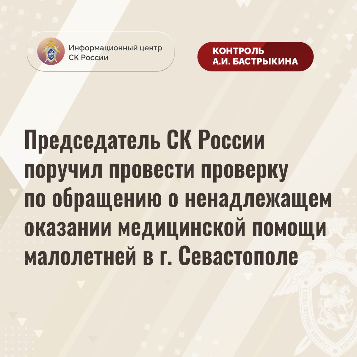Председатель СК России поручил провести проверку по обращению о ненадлежащем оказании медицинской помощи малолетней в г. Севастополе