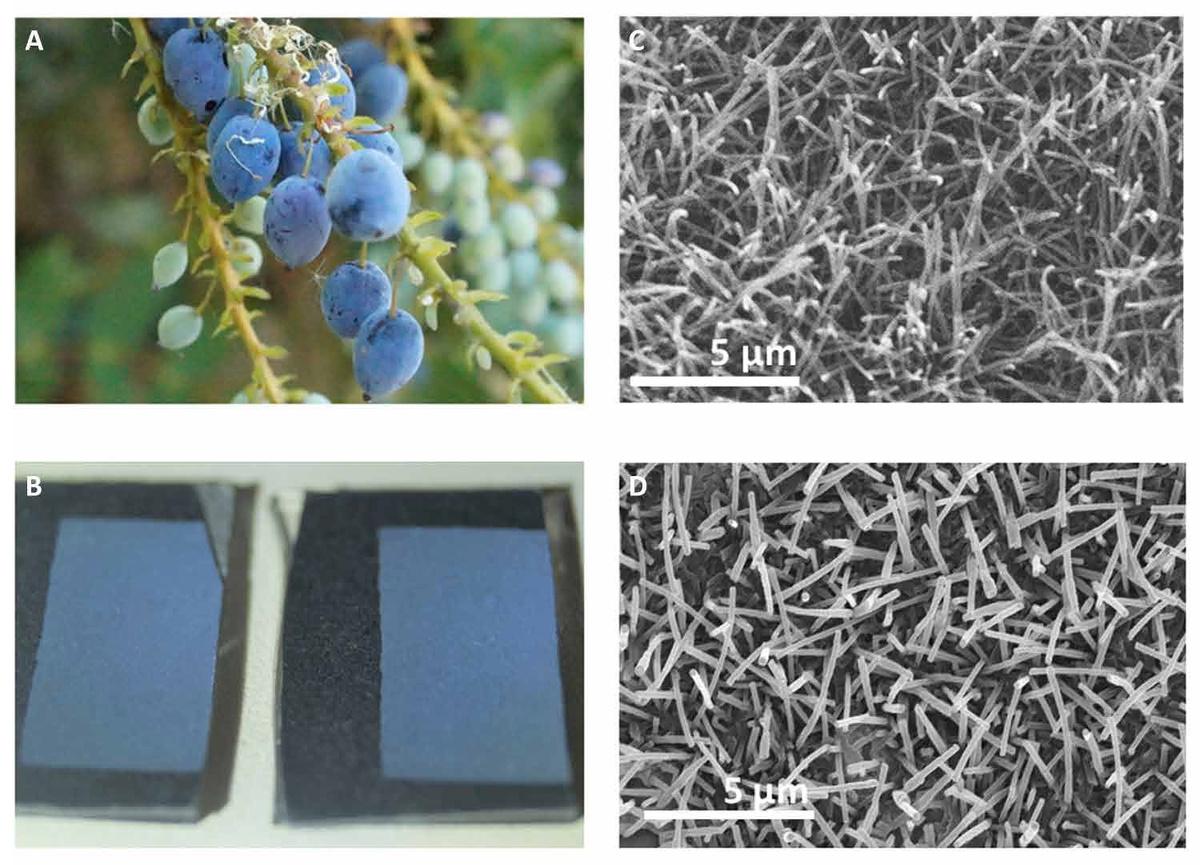 (Результаты: химия. «ХиЖ» 2025 №2) Ответ на вопрос в заголовке кажется очевидным — в кожице ягоды много антоцианов, они и придают такой цвет. Однако этот ответ неверен: пигмент в ягодах красный, это видно по цвету сока. А синими они становятся благодаря наноструктурам в воске, покрывающем ягоды. Такая структурная окраска делает синими многие плоды, от слив до ягод можжевельника. Устройство соответствующих наноструктур изучили британские ученые из Бристольского университета во главе с Роксом Мидлтоном (Rox Middleton). Обычно структурную окраску придают регулярно расположенные наночастицы одинакового размера, то есть фотонный кристалл. Классическим примером служит опал. А на кожице синих ягод оказалось фотонное стекло — неупорядоченно и довольно рыхло расположенные наночастицы воска одинакового размера. Форма этих частиц — цилиндры, кубы, балки, причем для каждого вида растения своя морфология. Суть же в том, что на такой структуре лучше всего рассеивается свет, длина волны которого близ