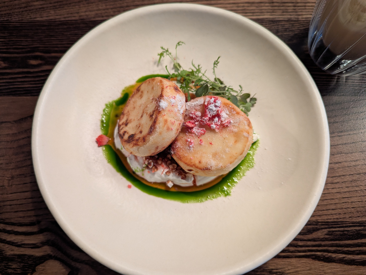 Это шанежный тост с картофельным кремом, северными креветками и соусом биск. Слышали когда-нибудь такое?