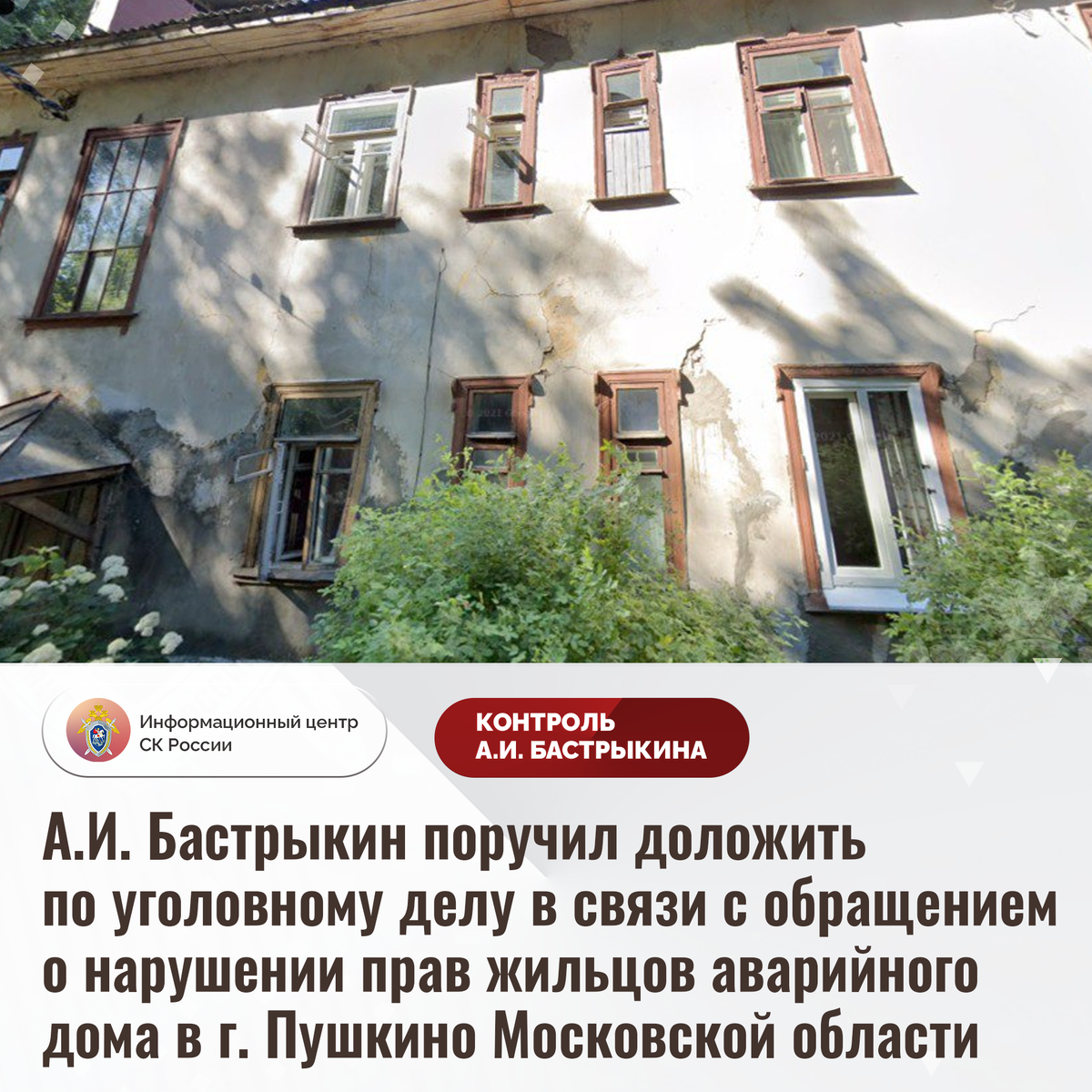 А.И. Бастрыкин поручил доложить по уголовному делу в связи с обращением о нарушении прав жильцов аварийного дома в г. Пушкино