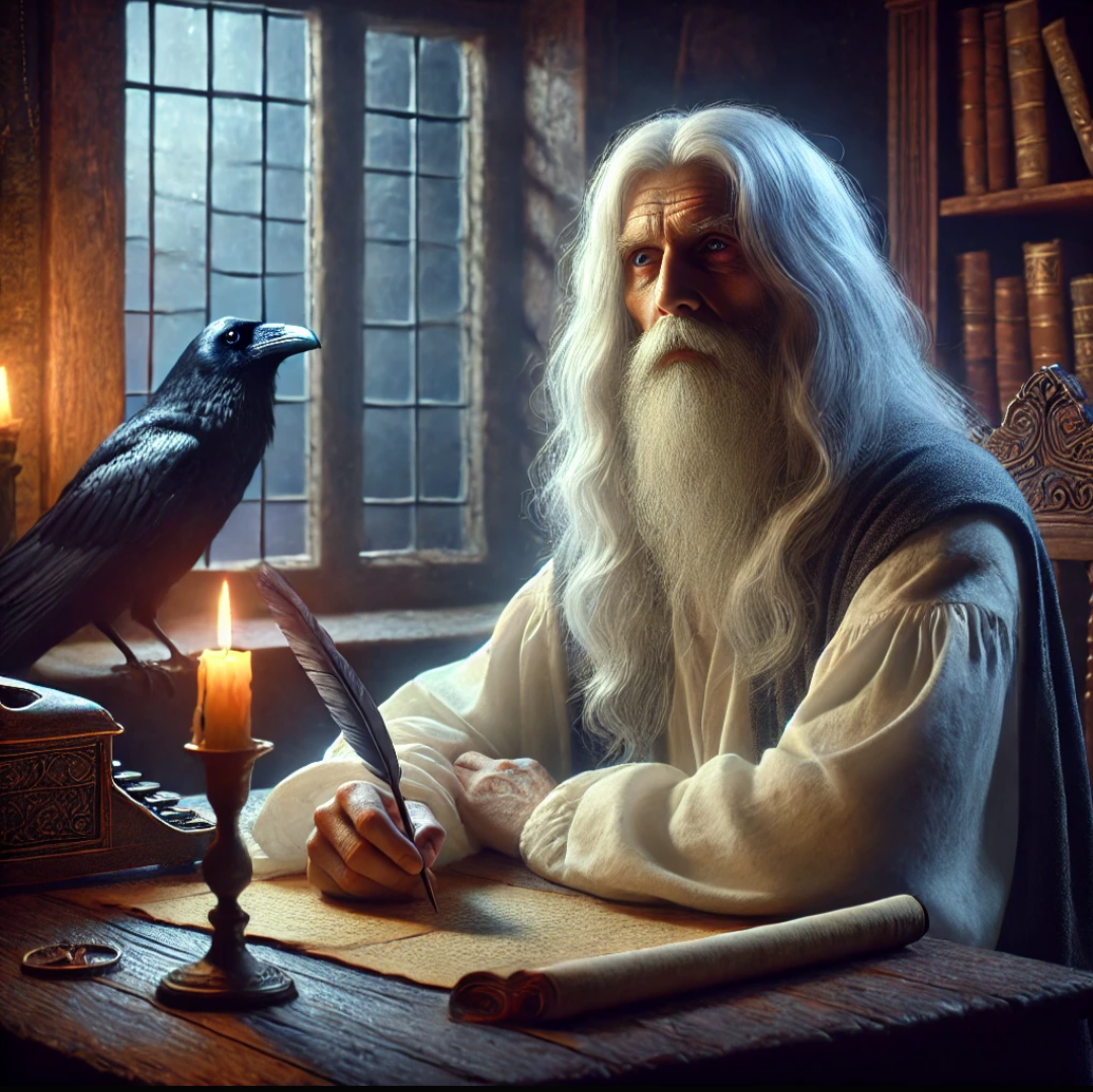 Лунный свет, блестят дороги. Ворон послан прошлой ночью. Он летит, над морем, Под небосводом темным. Звёзды указали путь домой. Летит он день и ночь, Под солнцем и луною. Умирая и рождаясь вновь. Все время - трансцендентно. Но, не здесь. По заходу солнца , умирает все. Но мертвым быть не может. Это, нечто, этакое другое. Где все есть сущее живое, Где есть живая мысль Пропитана везде. В тебе , во мне, И в ветре дуновения. И время..- зримо. Как на ладони. Словно катушка магнитофона. Оно уходит, и приходит. Как волны моря. Как жизнь и сон. Все умирает. Все затухает. Но не уходит все бесследно. На месте , бывшим жизни обитания Всегда вернётся что-то вновь. *** Миновало 8 дней и столько же ночей. Летел он видя цель. В последний день, узрел он конец моря. Закрыл глаза, дабы насладился немного. И продолжил путь домой. Прилетел он и увидел старика, Сидевшим за столом. С пером. И волосы его были длинны, седые. Усталые голубые глаза. Тогда сказа
