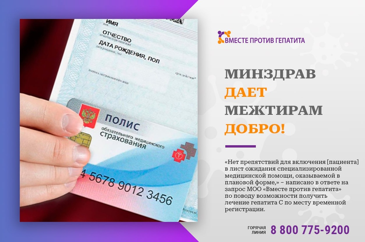 МОО «Вместе против гепатита» обратилась в Минздрав РФ с просьбой разъяснить: можно ли по месту временного пребывания получить терапию гепатита С предоставляемую за счет средств ОМС в рамках базовой программы госгарантий. «Нет препятствий для включения [пациента] в лист ожидания специализированной медицинской помощи, оказываемой в плановой форме,» – написано в ответе Минздрава на наш запрос. Напомним, что начиная с 2023 года в соответствии постановлением Правительства РФ от 28.12.2022 №2497 (№2353 от 28.12.2023, №1940 от 27.12.24), оказание медицинской помощи больным с гепатитом С осуществляться за счет средств обязательного медицинского страхования в рамках базовой программы обязательного медицинского страхования. Формально, в соответствии со статьёй 41 Конституции Российской Федерации и статьёй 16 Федерального закона от 29.11.2010 № 326-ФЗ «Об обязательном медицинском страховании в Российской Федерации» каждый гражданин, вне зависимости от места постоянной регистрации, имеет право пол