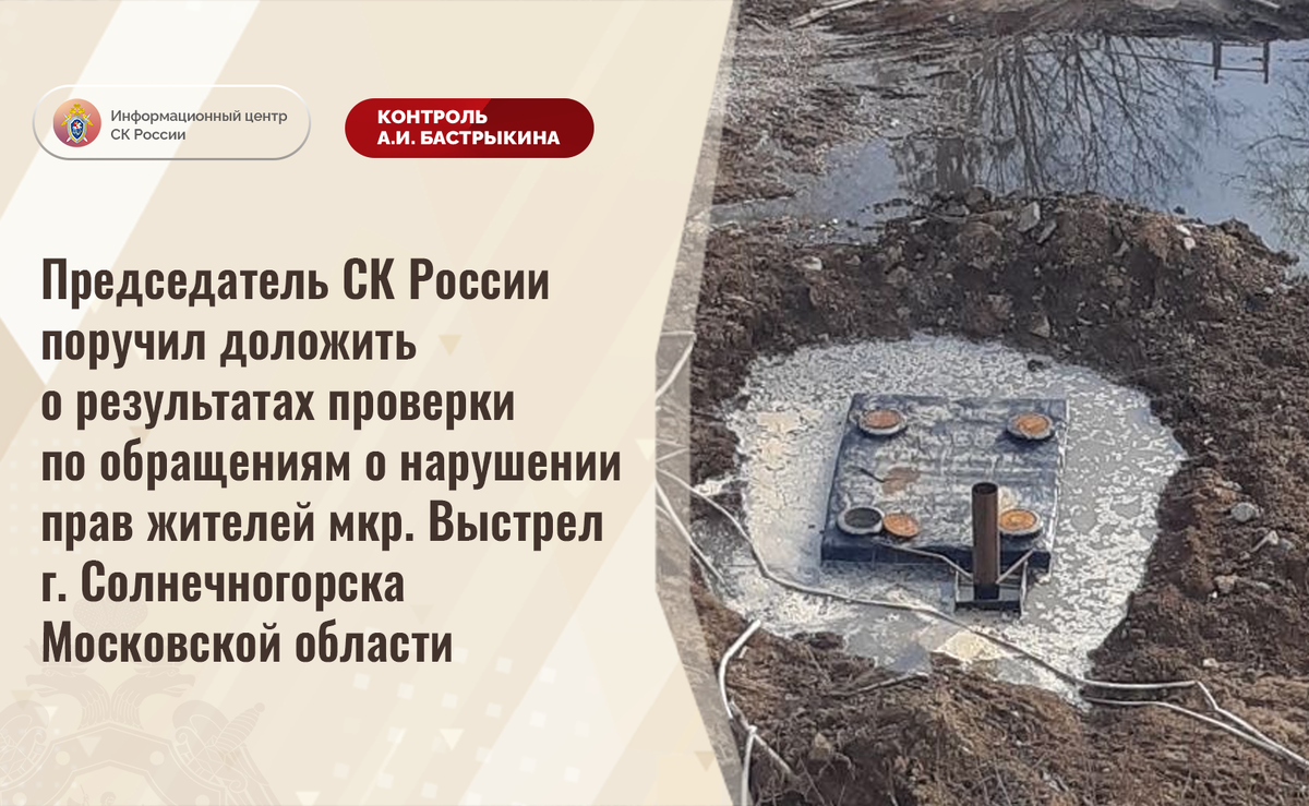 Председатель СК России поручил доложить о результатах проверки по обращениям о нарушении прав жителей мкр. Выстрел г. Солнечногорска Московской области В комментариях в социальной сети размещены обращения в СК России по вопросу нарушения прав жителей микрорайона Выстрел города Солнечногорска Московской области. Из-за значительного износа коммунальных систем в текущем году произошел прорыв канализационных труб, в результате чего территория, прилегающая к жилым домам, и тепловая камера системы горячего водоснабжения оказались затоплены сточными водами. Несмотря на многочисленные обращения граждан в администрацию, мер к разрешению проблемы и ликвидации последствий аварии не принимается, так как территория находится в ведении оборонного ведомства. Ситуация освещается в СМИ. В Главном военном следственном управлении СК России по данному факту организована процессуальная проверка. Председатель Следственного комитета Российской Федерации Александр Иванович Бастрыкин поручил врид заместителя