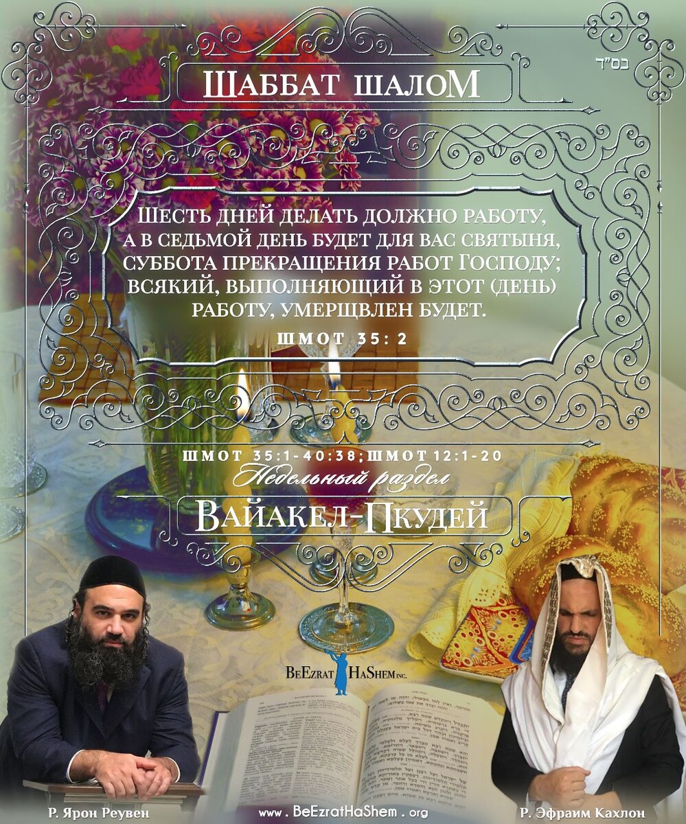 21 адара 5785 — 21 марта 2025 🤲 «Исполнить хочу волю Твою, Б-г мой, и Тора Твоя внутри меня». (Теѓилим 40:9). 🙌 Пусть этот Шабат для всех нас будет счастливым, мирным, радостным в кругу родных и близких! Чтобы в каждом доме горел свет Субботних свеч. Доброй и мирной субботы 🙏 😃 Нужно Верить, что Все к Лучшему 📜 Место в Торе: — Шмот, гл.35-38 📜 Недельная Глава: «Ваякель» («И собрал»). Автор: «Оцарот» Наши поступки должны быть продиктованы одной-единственной мыслью: «Что мы скажем о них на Высшем суде?» Главы колен народа Израиля, которые принесли дары не вовремя, лишились упоминания своих имен в Торе. Тора подробно рассказывает о том, как были собраны дары для постройки Скинии Завета. Она упоминает имена дарителей — за исключением глав колен Израилевых: «А главы принесли камни ониксы» (Ваякель 35:27). Согласно комментарию Раши, дело обстояло следующим образом. Если при построении жертвенника главы колен были первыми, кто принес необходимые дары, процесс постройки Скинии выглядел п