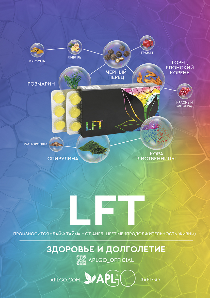 LFT(произносится «лайф тайм») – от англ. LIFETIME (продолжительность жизни) LFT – позаботится о вашем долголетии за счет качественного клеточного питания. Драже способствуют замедлению процесса старения клеток и помогают сохранить молодость и здоровье. Преимущества · Имбирь · Состав корня имбиря уникален: никотиновая и линолевая кислоты, витамины рибофлавин, В12, С, магний, селен, хром, фосфор, молибден. Ускоряет обмен веществ, стимулирует процесс клеточного метаболизма, укрепляет иммунитет и выводит из организма токсины. Быстро восстанавливает силы после продолжительного стресса или высокой нагрузки. · Гранат · Гранат содержит пищевые волокна, белки, витамины С, К, фолиевую кислоту и калий. Гранат укрепляет иммунитет, способствует улучшению кровотока, стимулирует питание клеток и, как следствие, повышает выносливость организма и его сопротивляемость. · Куркума · Куркума содержит витамины С, К и витамины группы В, железо, фосфор, долин, йод и кальций, а также полезные эфирные масла. Ра