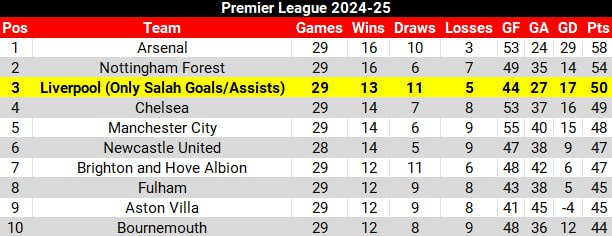 В этом сезоне «Ливерпуль» претендовал на четыре награды, но по итогу в списке осталась только АПЛ. В Лиге чемпионов команда проиграла по сумме двух встреч «ПСЖ», «Плимуту» в Кубке Англии и в финале Кубка Лиги «Ньюкаслу». Параллельно с этим форвард «Ливерпуля» Мохамед Салах проводит лучший сезон в Англии. Только в АПЛ на его счету 27 голов и 17 голевых передач. Всего «красные» забили 69 мячей, получается, что 39% из них случились благодаря египтянину, а общий вклад вместе с голевыми передачами еще больше. Для того, чтобы подчеркнуть этот невероятный вклад Салаха, болельщики показали, как бы выглядела таблица АПЛ, если бы учитывали только результативные действия Мо. Да, «Ливерпуль» не был бы первым, но все равно остался бы в тройке. Впечатляет?