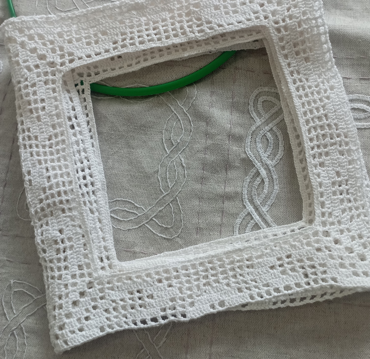 Приветствую всех на своём канале! Я продолжаю свою затею со скатертью. Как видите, всё в активном процессе. На данный момент уже связаны 5 мотивов каймы и соединены между собой. Я их слегка отпарила, но не стирала. Стирку буду проводить, когда свяжутся все мотивы и общая обвязка. Момент соединения мотивов Скоро будет готов уже и 6 мотив. Конечно, во время работы были и ошибки. Очень внимательно надо вязать, так как пропуск всего лишь одной петли в начале работы или пропуск одного столбика сразу ломает схему. И вот тогда на роспуск весь ряд. А это, я засекала, 40 минут вязания. Хоть и не первый раз вяжу такие мотивы, однако, ошибки всё же бывают. Что же у нас по вышивке? Здесь пока недалеко продвинулась. Всего вышила лишь 2 мотива, но один из них я распорола, Мне не понравились сами стежки, немного крупные получились. Не жалею, это всего лишь опыт. Второй мотив вышивки получился гораздо лучше. Ну вот, на этом этапе я пока нахожусь, продвигаю свою работу дальше. Благодарю всех за пр