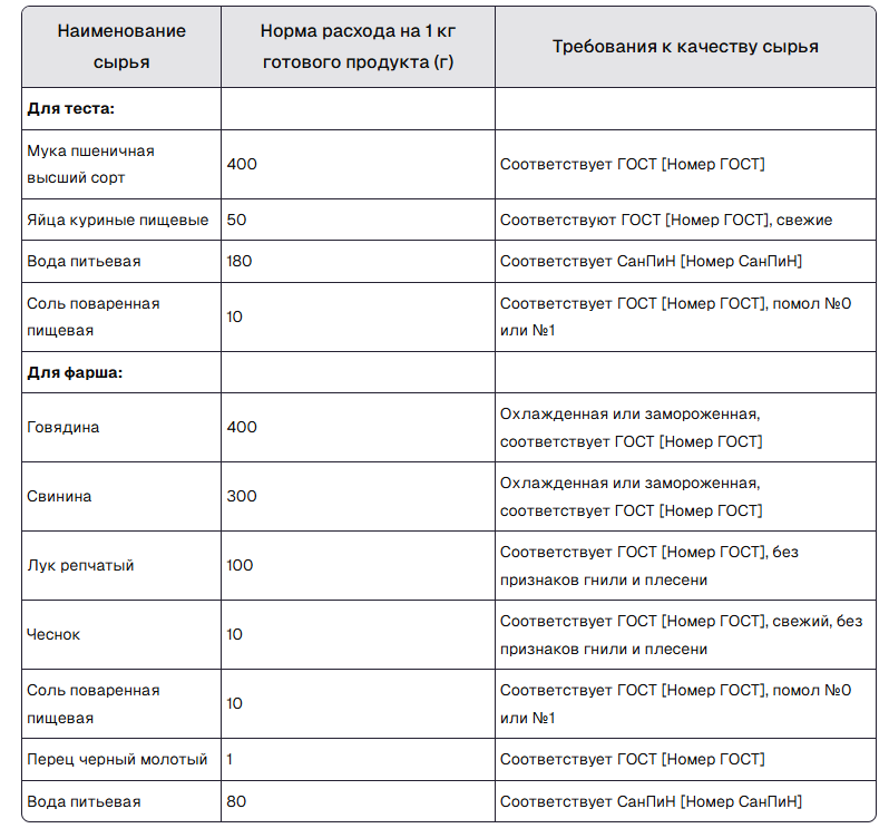- Вместо [Номер ГОСТ] и [Номер СанПиН] впишите актуальные номера стандартов и санитарных правил для вашей страны.