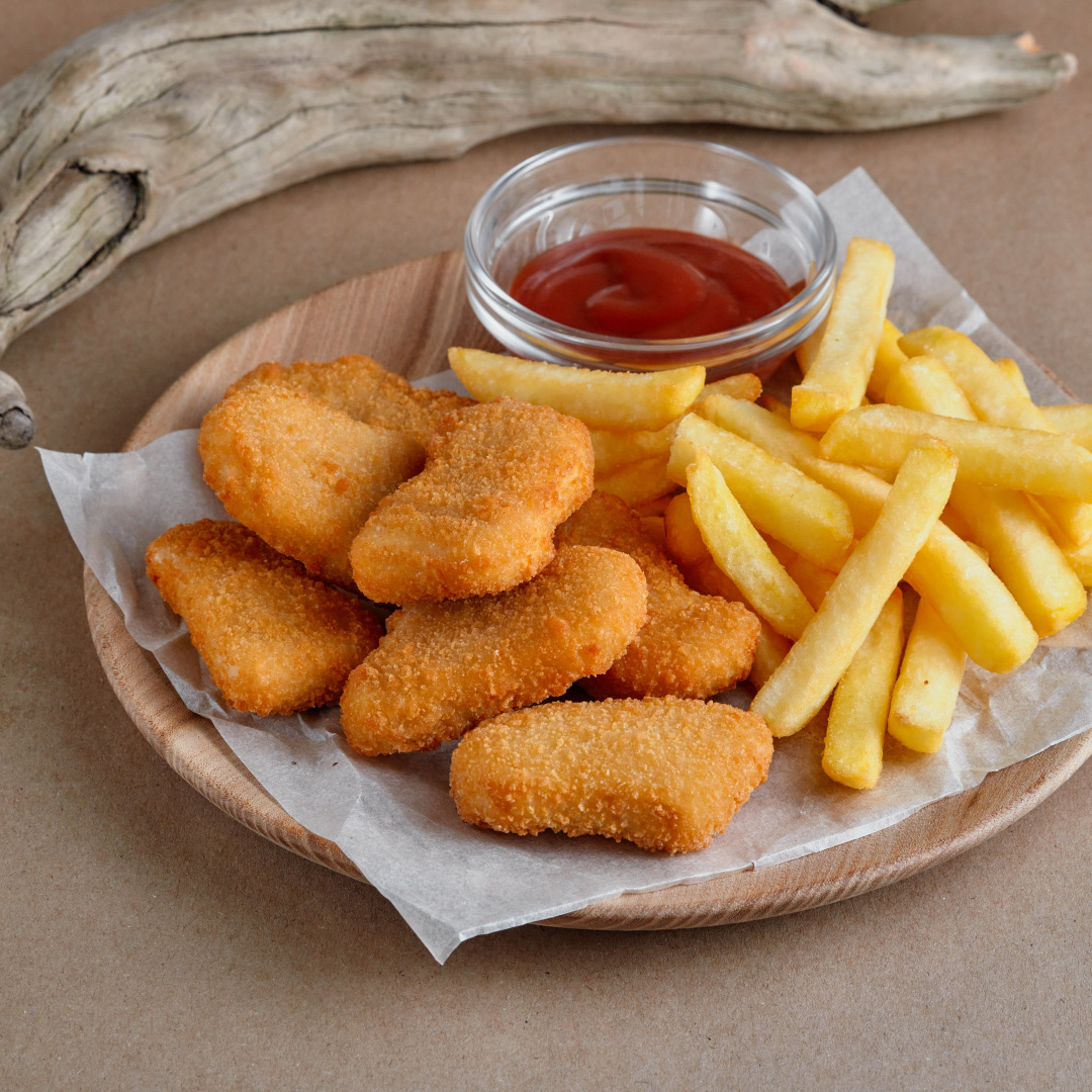 Куриные наггетсы — это хрустящая и сочная закуска, которую обожают и дети, и взрослые. Приготовить их дома легко, и они получаются даже вкуснее, чем в ресторанах быстрого питания! Ингредиенты: - Куриное филе (300-400 г) - Мука (3-4 ст. ложки) - Яйца (2 шт.) - Панировочные сухари (или кукурузные хлопья, измельченные в крошку) - Соль, перец, специи по вкусу (паприка, чесночный порошок, сушеные травы) - Растительное масло (для жарки) Приготовление: 1. Подготовьте курицу: Нарежьте куриное филе на небольшие кусочки (примерно 3-4 см в длину). Посолите, поперчите и добавьте специи по вкусу. 2. Приготовьте панировку: В одну миску насыпьте муку, во вторую взбейте яйца, а в третью — панировочные сухари или измельченные кукурузные хлопья. 3. Обваляйте кусочки: Обмакните каждый кусочек курицы сначала в муку, затем в яйцо, а потом в панировочные сухари. Повторите процесс, чтобы наггетсы получились более хрустящими. 4. Обжарьте: Разогрейте масло в сковороде или фритюрниц