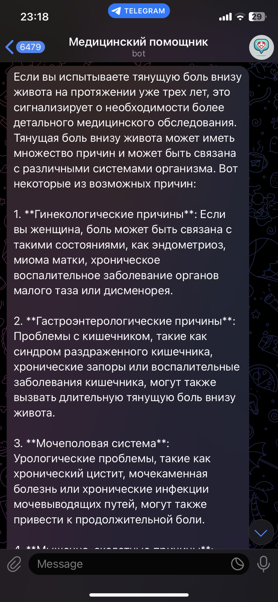 Я никогда не думала, что буду делиться этим публично. Но, возможно, моя история поможет кому-то не тянуть, как это делала я. У меня уже несколько лет тянущая боль внизу живота. Иногда терпимая, иногда — скручивает так, что не можешь ни работать, ни спать. Врачи? Да, я думала о них. Но каждый раз — то времени нет, то страшно, то денег жалко. Особенно, когда слышишь от подруг, как после приёма им навязывали анализы, процедуры и “курс лечения на 2 месяца за 50 тысяч”. Я просто привыкла жить с болью. И в какой-то момент даже перестала жаловаться. Но однажды наткнулась на пост в Telegram — бот, который помогает разобраться с медицинскими вопросами бесплатно. Работает 24/7, не требует регистрации. “Ну ладно, хуже не будет”, — подумала я. Написала. И знаешь что? Он ответил. Без давления, без осуждения, без “срочно сдайте это и это”. Я просто описала свои симптомы — бот задал уточняющие вопросы и выдал предположения, что это может быть и какие обследования стоит сделать. Впервые за долг
