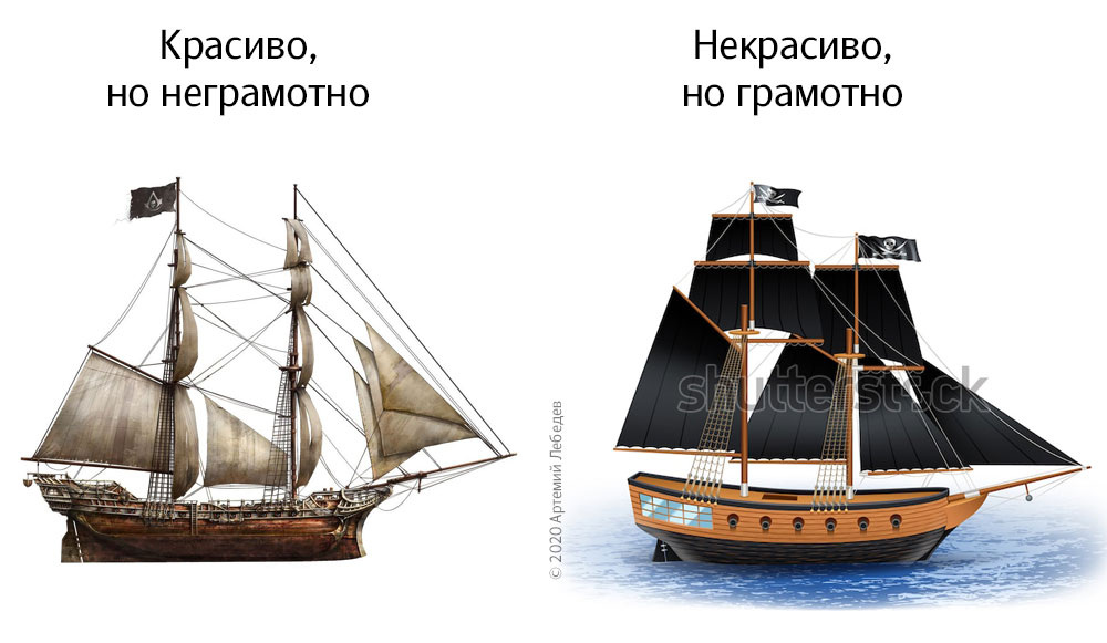 У моторного судна флаг смотрит назад, потому что мотор тащит корабль вперед с большой скоростью. У парусного судна флаг смотрит вперед (или в какой-либо бок), потому что в него дует ветер. Корабль может идти против ветра, но все равно под углом, так что флаг назад может смотреть только в том случае, когда корабль стоит. Флаг, который висит на корме парусного корабля, может смотреть назад, потому что находится в тени парусов и развевается уже от скорости. Но флаг на мачте подвержен только ветру. Таким образом мы всегда можем вычислить неграмотных иллюстраторов, об этом всегда должен помнить арт-директор.