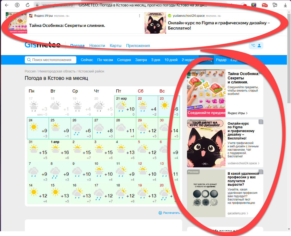 На скриншоте ниже сайт www.gismeteo.ru без использования расширения AdBlockPlus