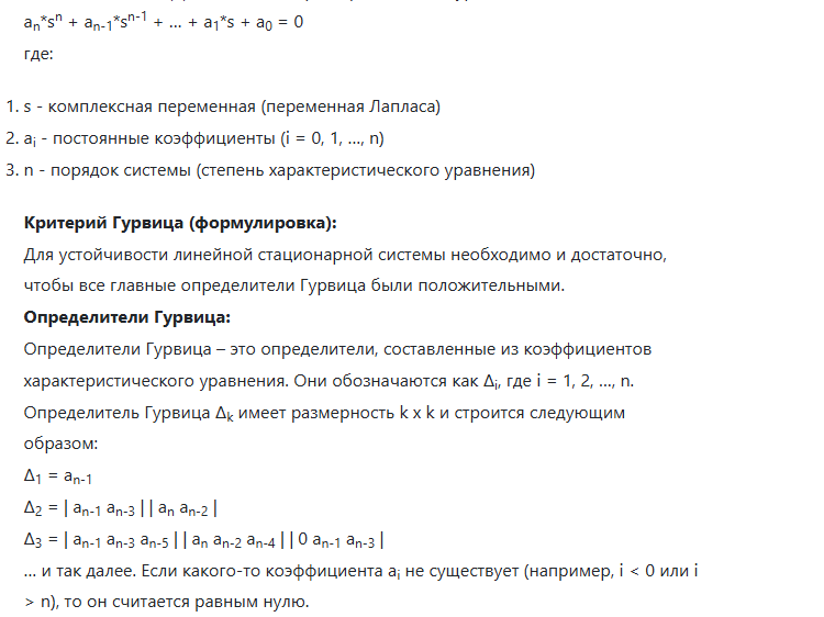 Критерий Гурвица — это алгебраический критерий устойчивости линейной стационарной системы автоматического управления (САУ) с постоянными коэффициентами. Он позволяет определить, является ли система устойчивой, зная только коэффициенты характеристического уравнения, без необходимости нахождения корней этого уравнения. Что такое устойчивость системы: Устойчивость САУ означает, что система, выведенная из состояния равновесия под воздействием какого-либо возмущения, возвращается в это состояние равновесия после прекращения действия возмущения. Иными словами, переходные процессы в устойчивой системе затухают со временем. Неустойчивая система может либо колебаться с нарастающей амплитудой, либо уходить в бесконечность. Характеристическое уравнение: Характеристическое уравнение получается из передаточной функции замкнутой системы. Для системы, описываемой дифференциальным уравнением с постоянными коэффициентами, характеристическое уравнение имеет вид: Условия устойчивости по Гурвицу: Недостат