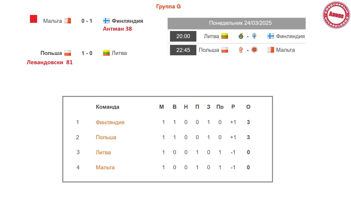 Доброй ночи. Стартовал турнир, который мы очень, очень, очень долго ждали. Сегодня рассказываю о первом туре отбора к чемпионату мира в зоне УЕФА. Группа G. Хозяева с 78-й минуты играли в меньшинстве и самое забавное вовсе не заслуживали поражения, поскольку по коэффициенту ожидаемых голов наиграли на 2 мяча, а по ударам и вовсе в 2 раза превзошли соперника. Хозяева давили всю игру, владения мячом достигло 61%, но лишь на 81-й минуте поляков от позора спас легендарный Роберт Левандовски. Это первая победа сборной Польши за 6 последних официальных игр. Таблица. Финляндия, Польша – 3 очка. Литва, Мальта – 0 очков. Следующий тур запланирован на 24 марта. В этот день Литва встретится с Финляндией, Польша примет Мальту. Группа H. В первом тайме киприоты не смогли открыть счет с пенальти. В целом они целых 5 раз позволили футболистам Сан-Марино пробить по собственным воротам. Довольно неожиданный счет, учитывая, что румыны почти по всем показателям превзошли соперника в игре - удары по вор