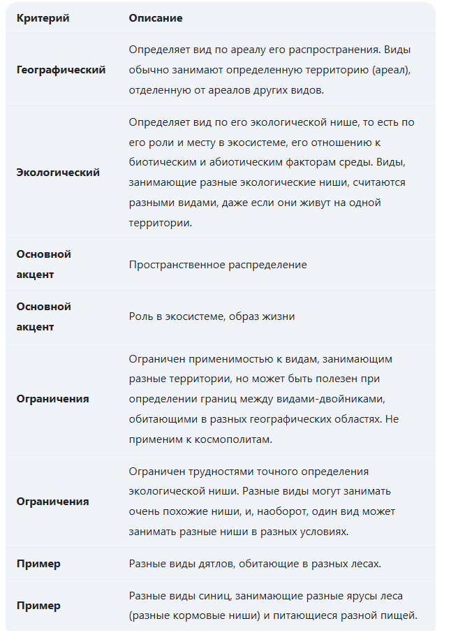 Укажите сходство и различия между географическим и экологическим критериями