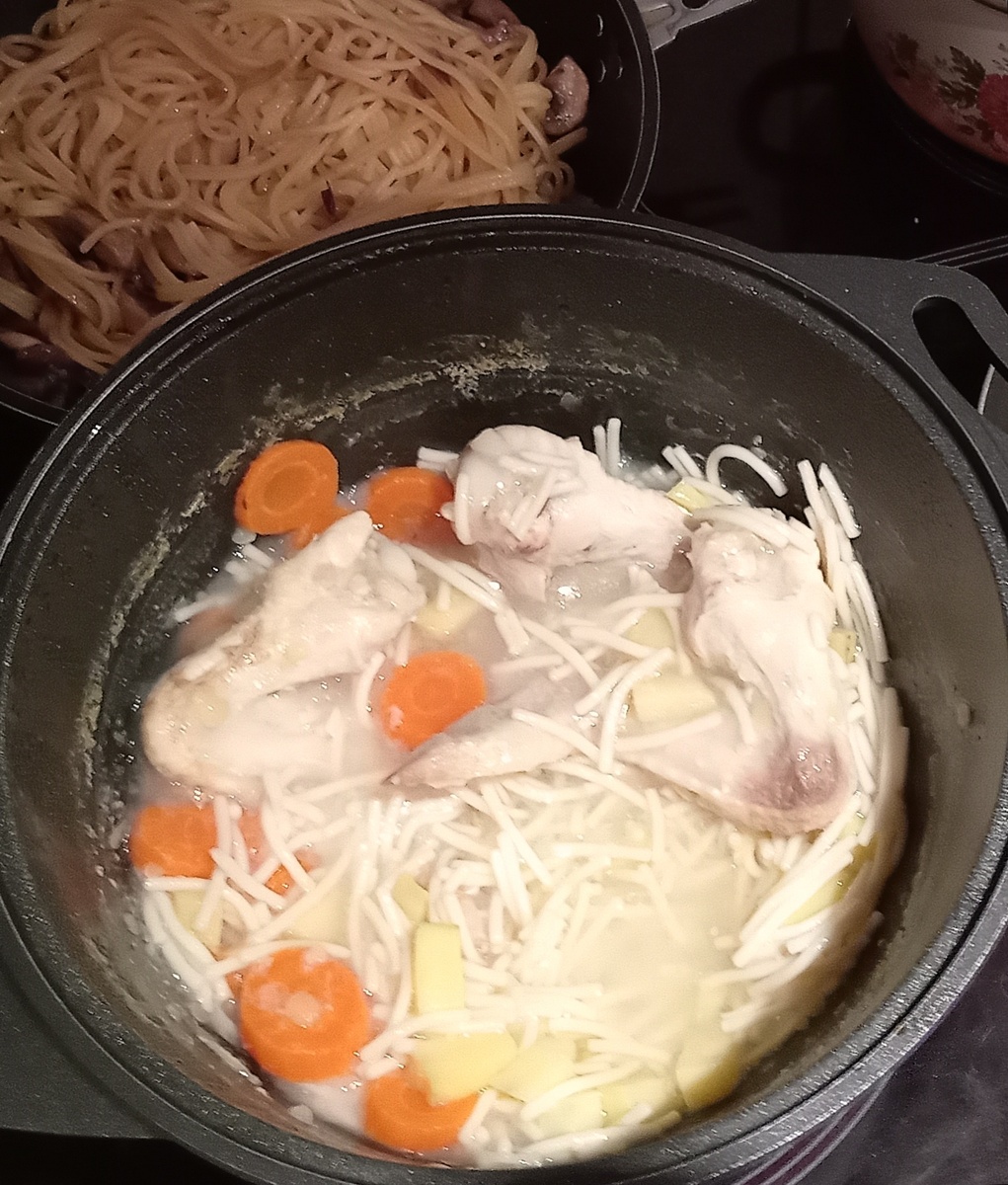 Я за это время разработала новый план питания и меню. Что-то из любимого оставила, что-то пришлось убрать. Я решила последить за своим питанием, не то чтобы прям диета, нет, тортики и вкусняшки я продолжаю есть. Тут скорее излюбленное всеми сочетание БЖУ в рационе. Обычно я ем что есть или по настроению. В моем меню может не быть месяц супов, или фруктов. Поэтому решила немного добавить ПП в повседневную жизнь. Начнём с супа, я режу морковку крупно, потому что не ем варёную и мне так её проще вытаскивать, но без неё вкус бульона не тот. Классический куриный суп ещё ни разу не подводил. Его я могу есть раз в неделю, что уже хорошо для того, что не признает супы. На заднем фоне виднеется макароны, честно, я люблю спагетти, но последнее время очень редко их ем. Возможно раньше слишком много их трескала, поэтому сейчас лишний раз не буду отваривать, но вот с дошираком такого нет, могу часто заваривать 😅 Классические мясные шарики с ними у меня тоже не всегда получается наладить контакт.