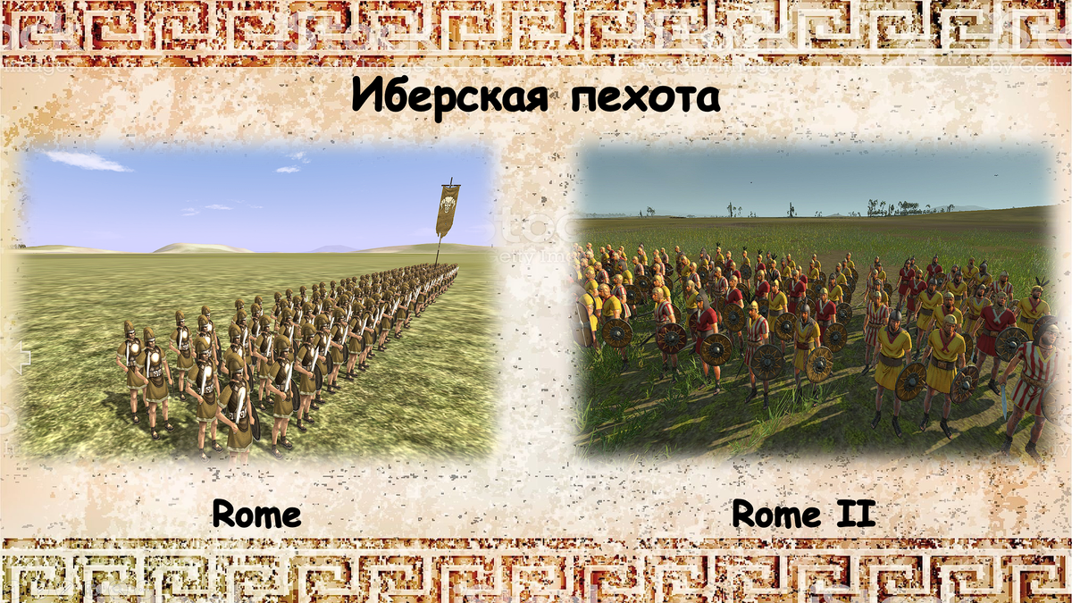 Иберская пехота (в локализации Rome: Total War иберийская пехота) – легкая пехота ближнего боя первого тира, доступная для найма Испании и Карфагену. Если читать внутриигровое описание, то иберская пехота вооружена коротким мечом и щитом. Из доспехов имеет только шлем. Но если рассматривать саму модельку воина, то мы увидим, что на них есть нагрудник. Тактически, иберская пехота – мобильное вспомогательное подразделение, в задачи которого входит обхват с флангов или заходы в тылы врага. Формировать из них ядро армии явно не стоит, так как они подвержены обстрелу и натискам кавалерии и с трудом способны побеждать даже копейщиков средней ценовой категории. Особых умений или способностей у иберской пехоты не имеется. Во втором Риме аналогом иберской пехоты выступает отряд иберских мечников. Они доступны для набора Аревакам и Лузитанам. Вооружены фалькатой и небольшим круглым щитом (цетрой). Из доспехов имеют только шлем. Иберские мечники – средняя пехота ближнего боя, с очень низким показ