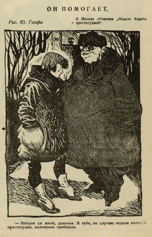 В марте 1925 года советская пресса шутила над разными темами. Например, над объявленной «Неделей борьбы с проституцией». Рисунок Юлия Ганфа (1898—1973). 1925 год. «Он помогает.