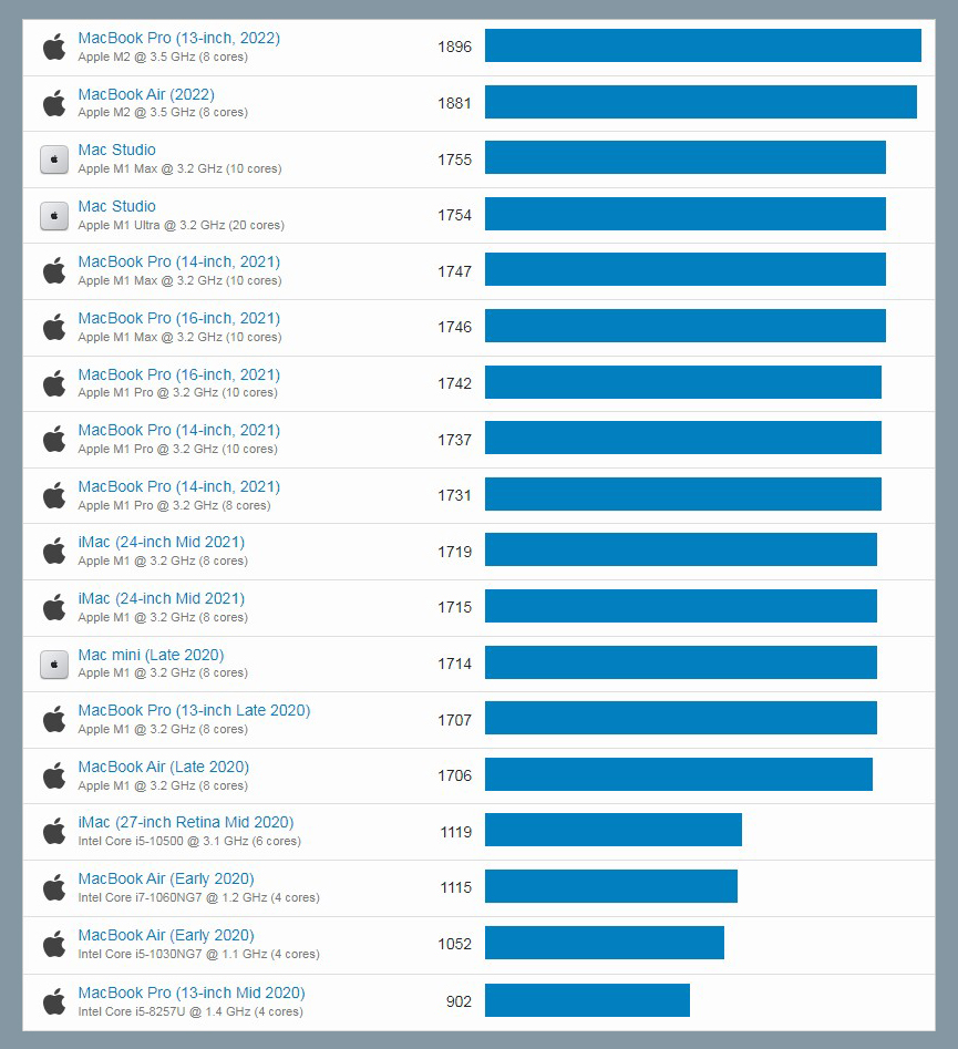 MacBook Air — это легкий и тонкий ноутбук, который идеально подходит для повседневных задач. Он приближен к идеалу для студентов, офисных работников и тех, кто просто хочет насладиться хорошим устройством для серфинга в интернете и работы с документами. Последние модели MacBook Air используют процессоры Apple M1 и M2, которые обеспечивают отличную производительность при низком уровне энергопотребления. В абсолютных цифрах производительность Air значительно возросла по сравнению с предшественниками, особенно в задачах, требующих многоядерной обработки.