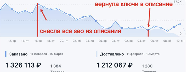 ПРОВЕЛА РИСКОВАННЫЙ ЭКСПЕРИМЕНТ🙈 ⚠️ Не повторять ⚠️ Много раз слышала, что описание имеет очень маленькое влияние по seo для карточки. Как говорят: все подтягивается в основном из наименования и характеристик. Я решила провести эксперимент🚀😁и проверить данное мнение. Одно дело когда карточка раскручена (тут легко понять), другое дело когда без продаж еще. Только с продажами можно четко увидеть разницу. 1️⃣У меня 2 кабинета, на одном я ничего не трогала, а на данном кабинете был тест. Товары одинаковые на обоих кабинетах, комплектация немного отличается. 2️⃣Я удалила 16 февраля все описание полностью оставив при этом такие же РК и ставки и такую же цену. 3️⃣Что мы видим, ровно с 16 февраля карточка стала падать в позициях и приносить все меньше и меньше заказов. 4️⃣5 марта я вернула ключи и позиции сейчас начнут восстанавливаться. ЭТО ВТОРОЙ КАБИНЕТ Тут продажи идут ровно, так как никаких экспериментов не проводилось. Чтобы было понимание, что сезона нет, реклама работала отлично на