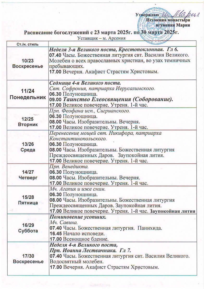 23-30.03. Расписание богослужений в Введенском женском монастыре города Иваново