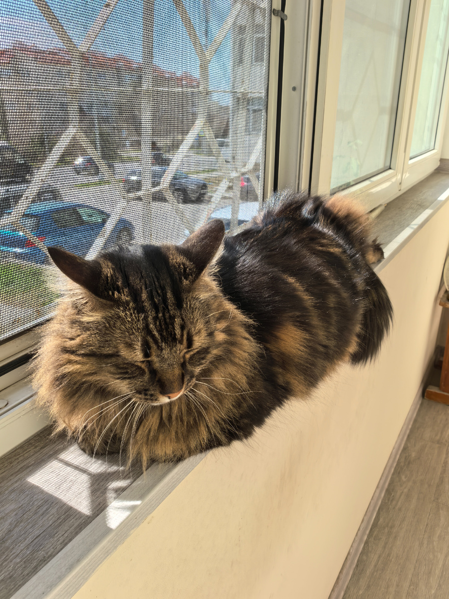 Всем привет! С вами Кузя Кусалочкин и сегодня я расскажу одну непонятную историю. Утром, как обычно, получил паштетик. Но так и остался голодным, посмотрел на хозяйку, она всё поняла и нарезала мне мяска. Проводил хозяина на работу и пошёл отдыхать. Погода довольно хорошая у нас была, лежал на солнышке: Но бдительность терять нельзя, поэтому ухи назад: И волосатая пяточка: Скоро сменю зимние носки на летние. Я спал на диване, хозяйка своими делами занималась и тут кто-то позвонил в домофон. Я подскочил и побежал к двери. Хозяйка подошла, но решила почему-то не спрашивать «кто там?». Она решила выглянуть в окно, никого не увидела (но там из-за подъезда не видно). Решила посмотреть камеру. На камере запись хозяйка чуть раньше стала смотреть и там всё было очень странно. Молодой человек (даже похож на школьника) подошёл сначала к соседнему подъезду, постоял. Потом пошёл вообще в сторону соседнего дома. Через время вернулся и целенаправленно подошёл к нашему подъезду, стал звонить, н